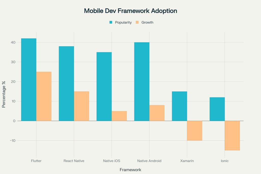 Analiza trendów rynkowych pokazuje wyraźny wzrost popularności Flutter wśród deweloperów i przedsiębiorstw. Framework osiągnął 42% udziału w rynku cross-platform, wyprzedzając React Native (38%). Szczególnie istotny jest 25% roczny wzrost adopcji Flutter w segmencie enterprise, co świadczy o dojrzałości technologicznej i biznesowej frameworka.