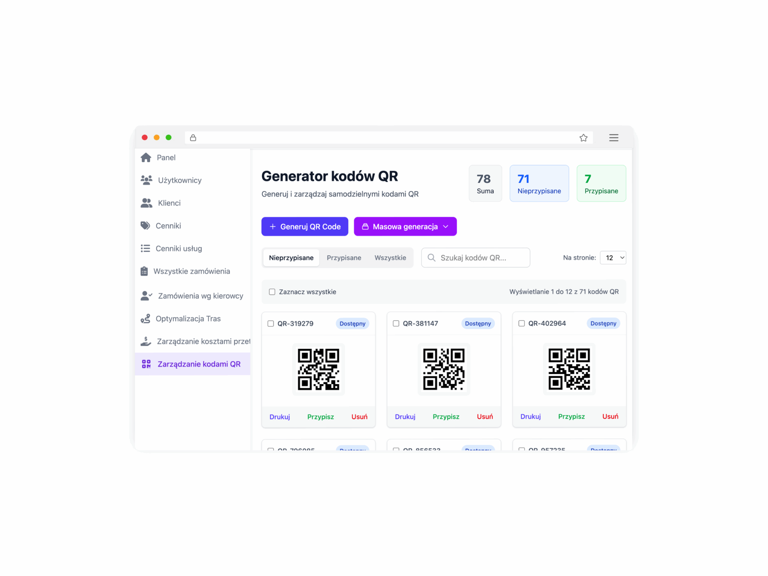 Za pomocą kilku kliknięć, można wygenerować i wydrukować dowolną ilość kodów QR, które później pracownicy mogą przypisywać do zamówień. Szybko i sprawnie.