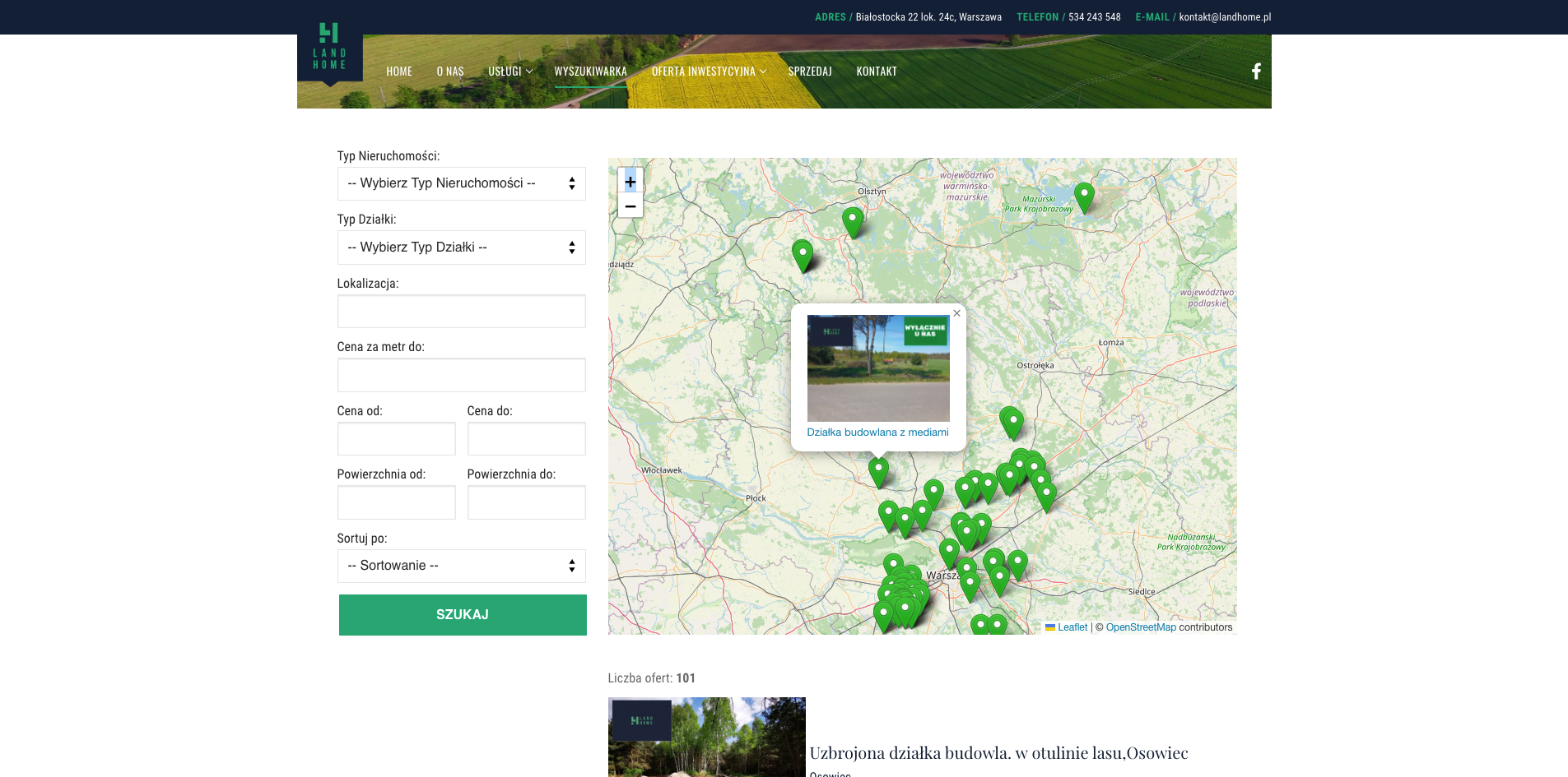 Klienci często odwiedzają stronę agenta nieruchomości, właściciel chciał by były na niej widoczne wszystkie oferty jakie ma do zaoferowania bez konieczności przekierowywania klientów na zewnętrzne serwisy. Dzięki szybkiej i łatwej w obsłudze wyszukiwarce wraz z mapką łatwo zlokalizować działki oraz zadzwonić do agenta, który je oferuje.
